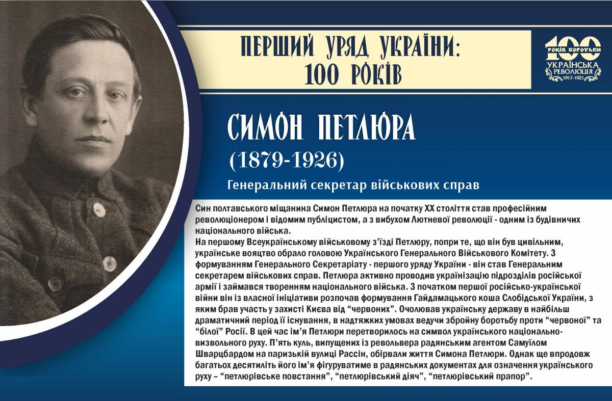 Симон Петлюра, генеральний секретар військових справ, голова Українського генерального військового комітету. 28 червня 1917 року Центральна Рада створила свій виконавчий орган – Генеральний Секретаріат – перший уряд України. (Щоб відкрити у більшому розмірі, натисніть на зображення. Відкриється у новому вікні)