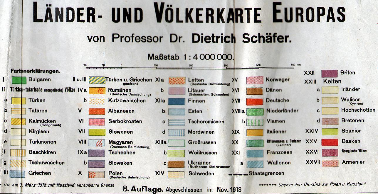 Додаток до карти країн і населення Європи професора Дітріха Шефера, 1918 рік, Німеччина. (Щоб відкрити мапу у більшому форматі, натисніть на зображення. Відкриється у новому вікні)