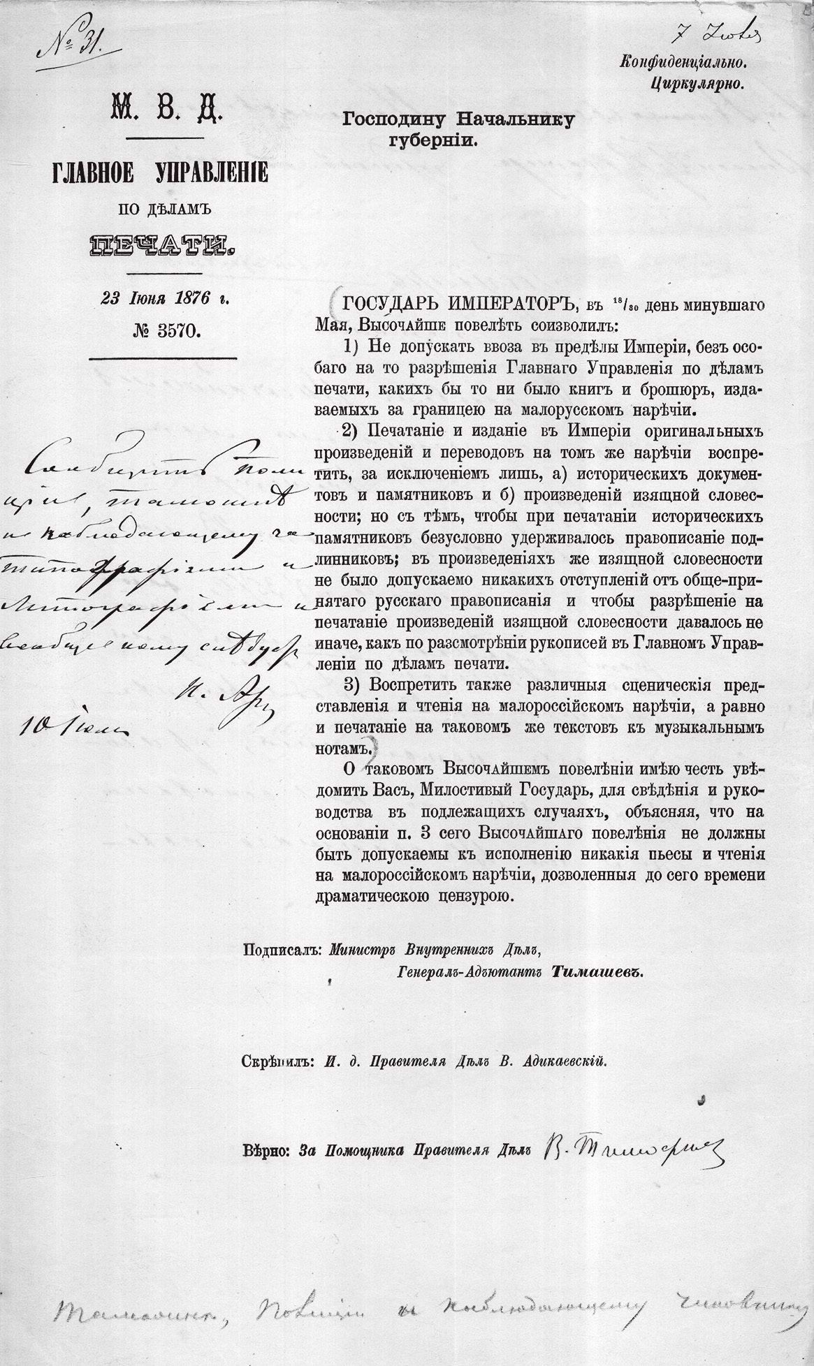 Циркуляр Головного управління у справах друку начальникам губерній з інформацією про Емський указ (1876)