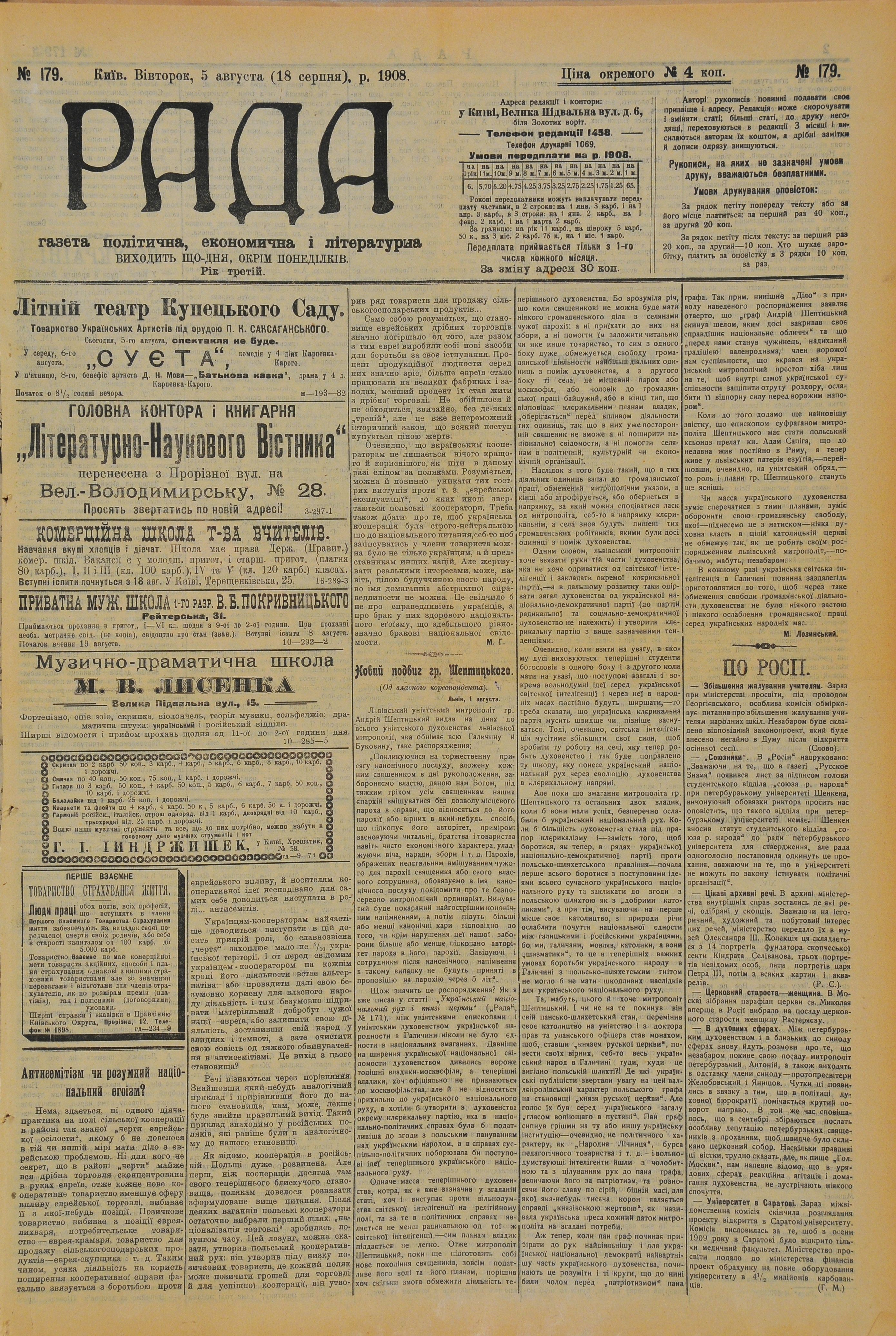 Газета «Рада» – щоденна українська громадсько-політична, економічна і літературна газета ліберального напряму українською мовою, яка виходила у 1906–1919 роках. Її видавав і фінансував Євген Чикаленко